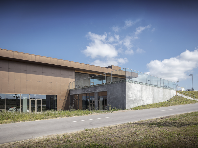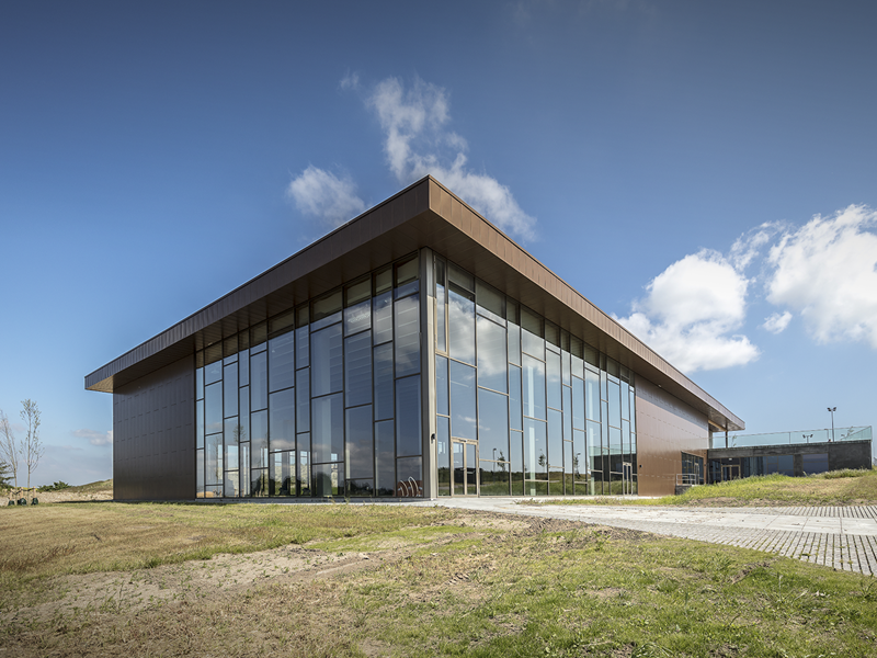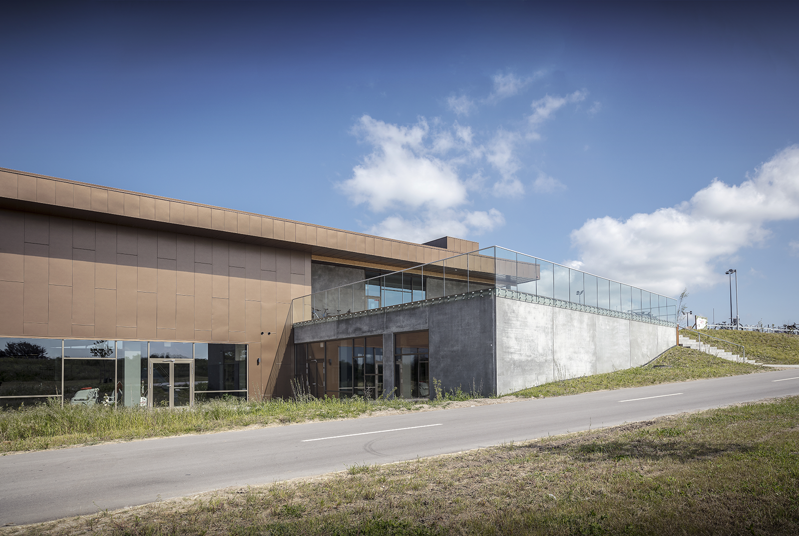 Svømmehallens arkitektur er enkel og skulpturel. Bygningen får et stort, svævende tag og udnytter det skrånende terræn på optimal vis og indpasser sig naturligt i landskabet med sine kobberfarvede facader og store glasflader.
