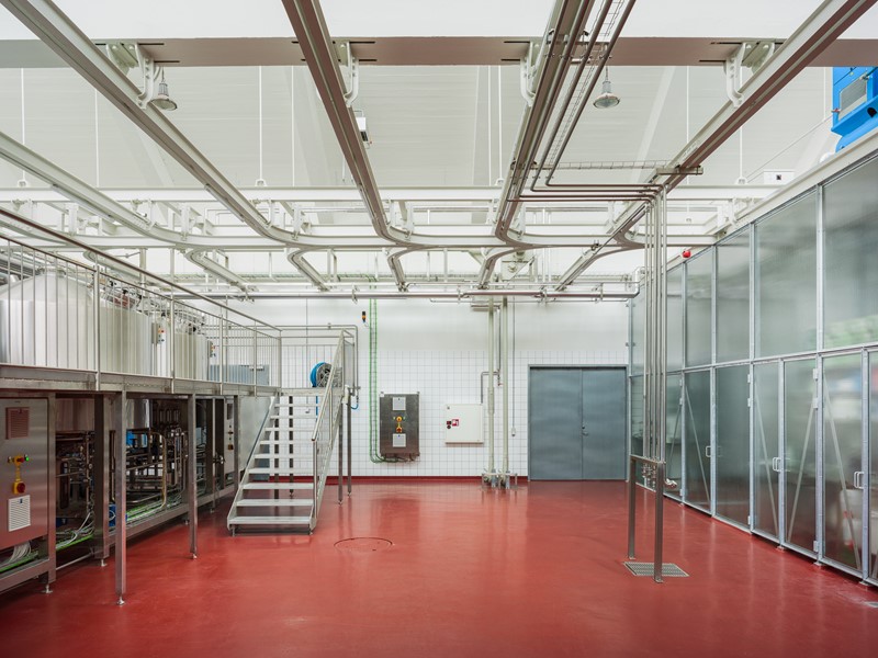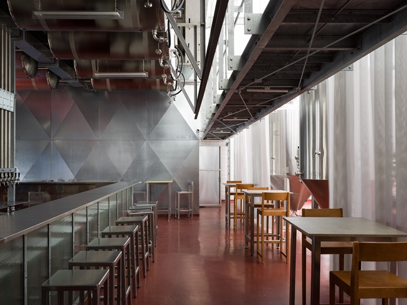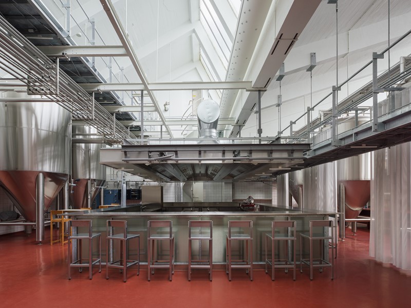 De semitransparente forhæng, den lavthængende gangbro og de koniske fermenteringstanke skaber en unik atmosfære. Indretningen understreger den historiske bygnings kvaliteter gennem sit samspil med det moderne produktionsapparat.