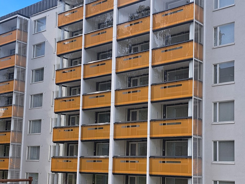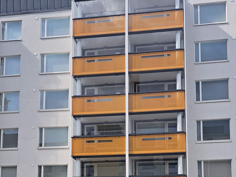Til dette renoveringsprojekt i Vantaa, Finland har vi produceret 450 m2 hærdet lamineret glasværn med digitalt keramisk print i dots - både i heldækkende og med clear part.