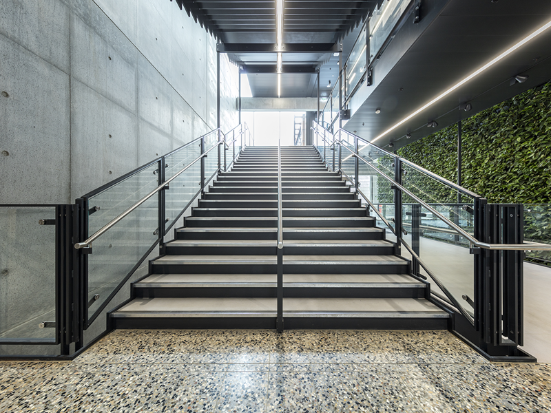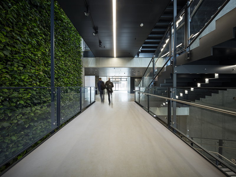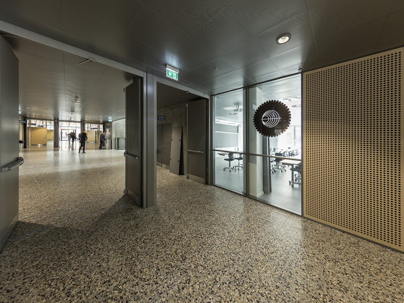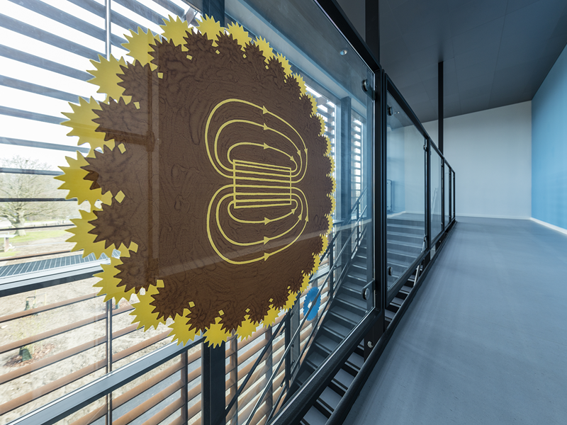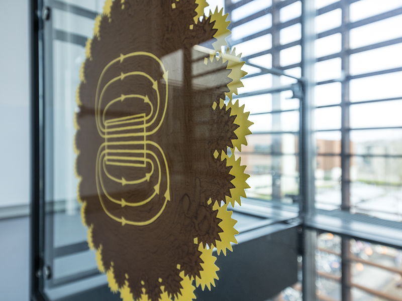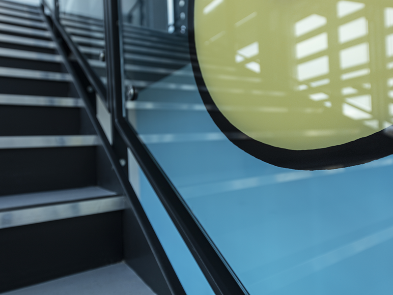Til SDU Teknisk Fakultet, Undervisningsbygningen har vi produceret indvendig glasværn og interiørglas med keramisk print designet af kunstner Lise Nørholm.