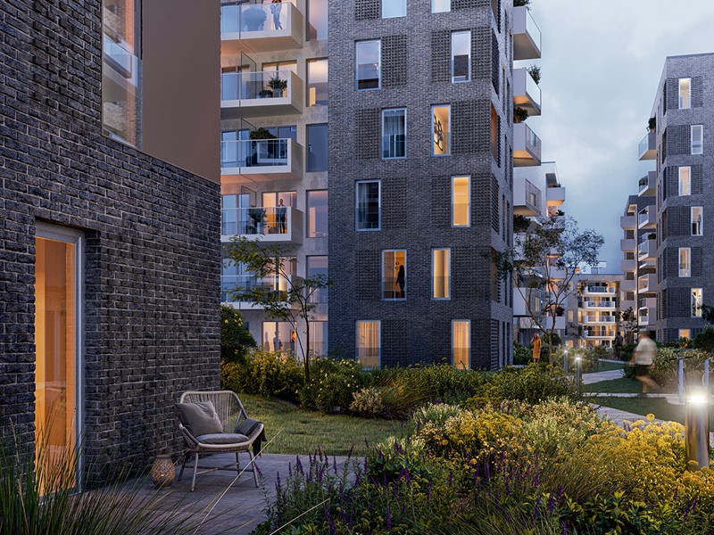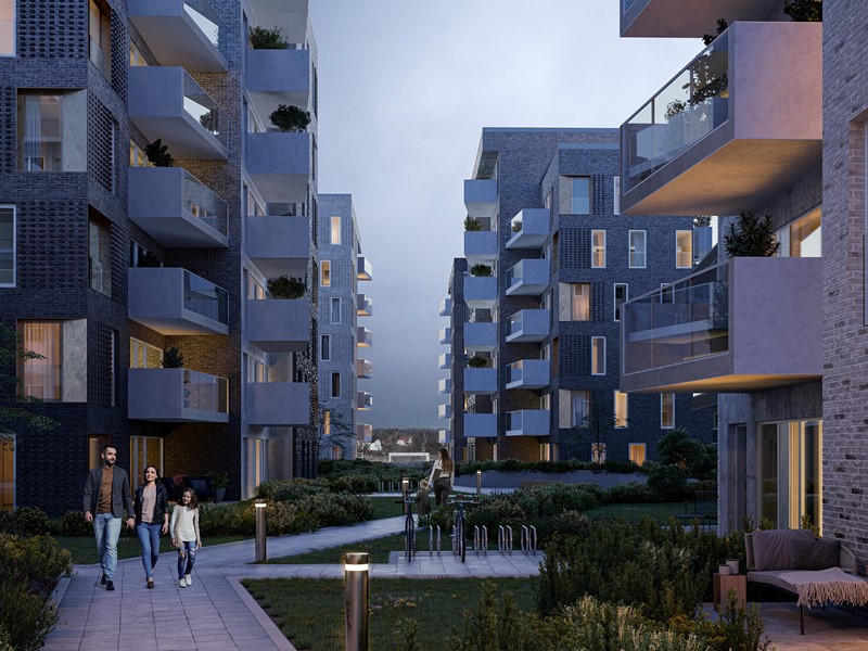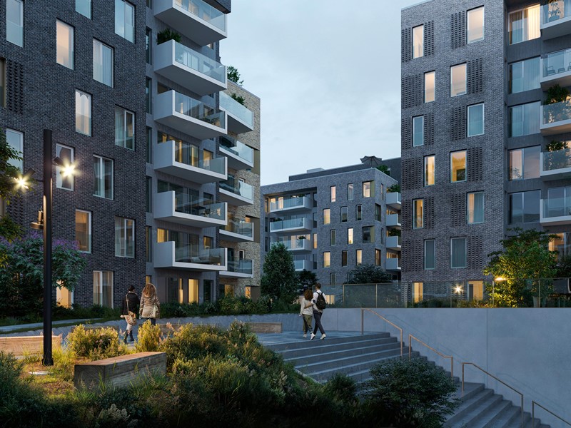 8 bygninger i forskellige højder med 5-8 etager og 283 eje- og lejeboliger