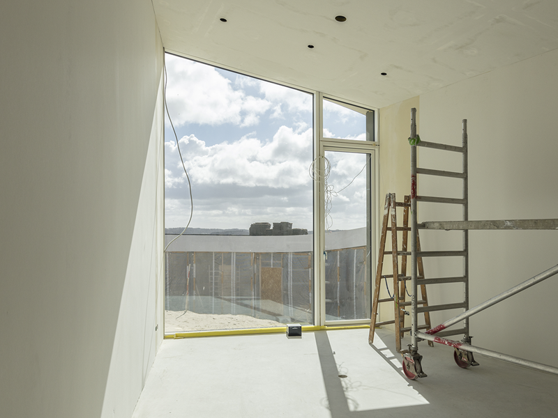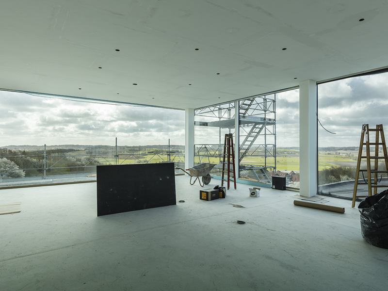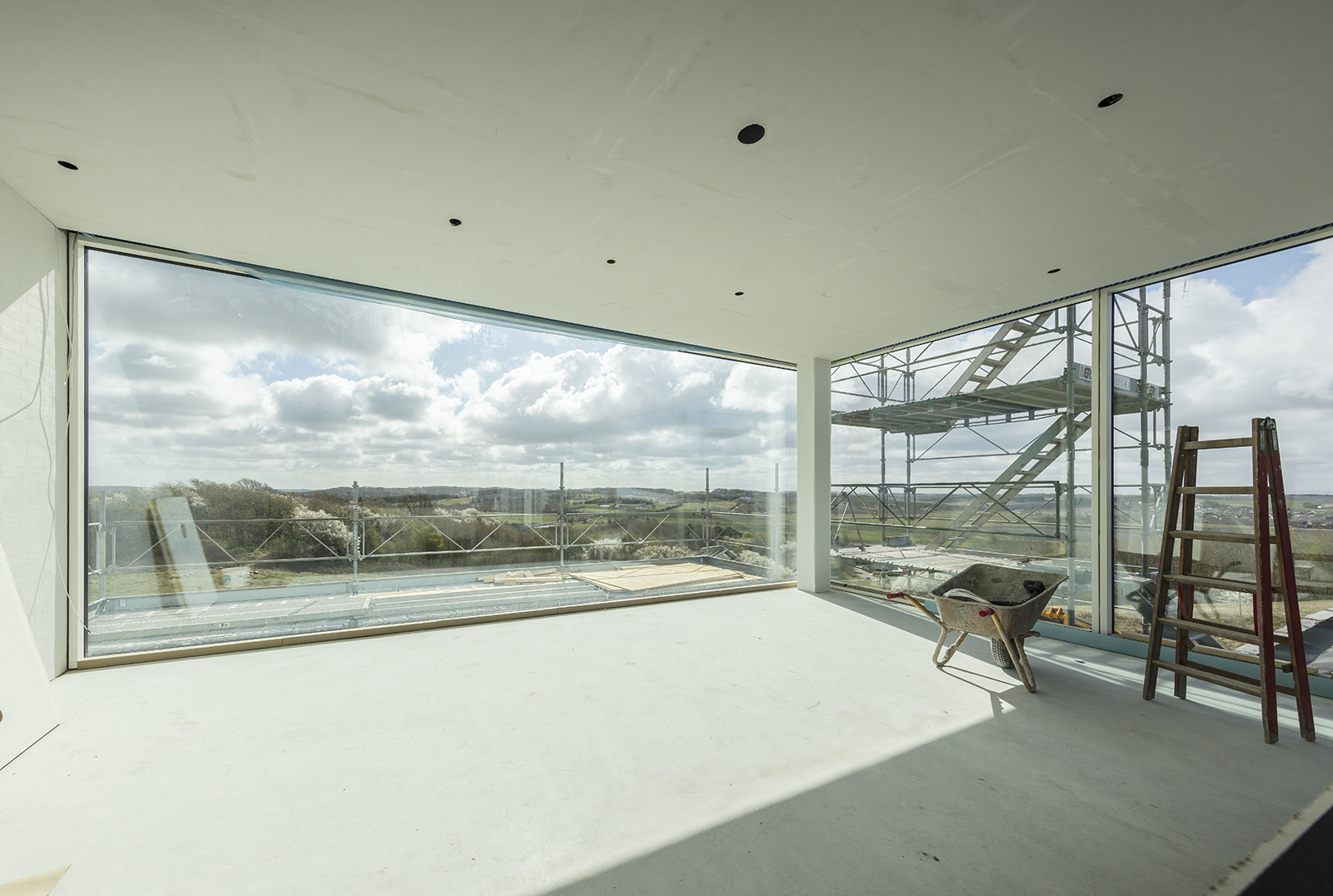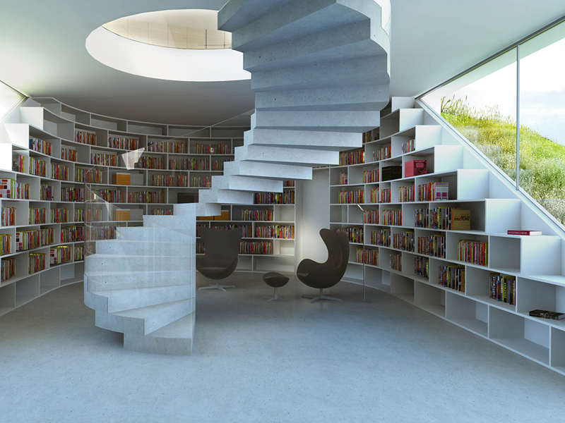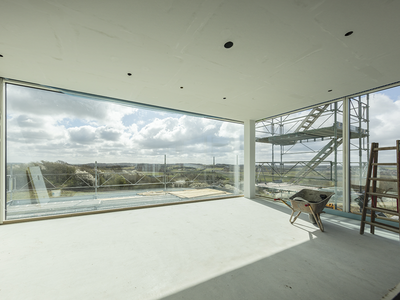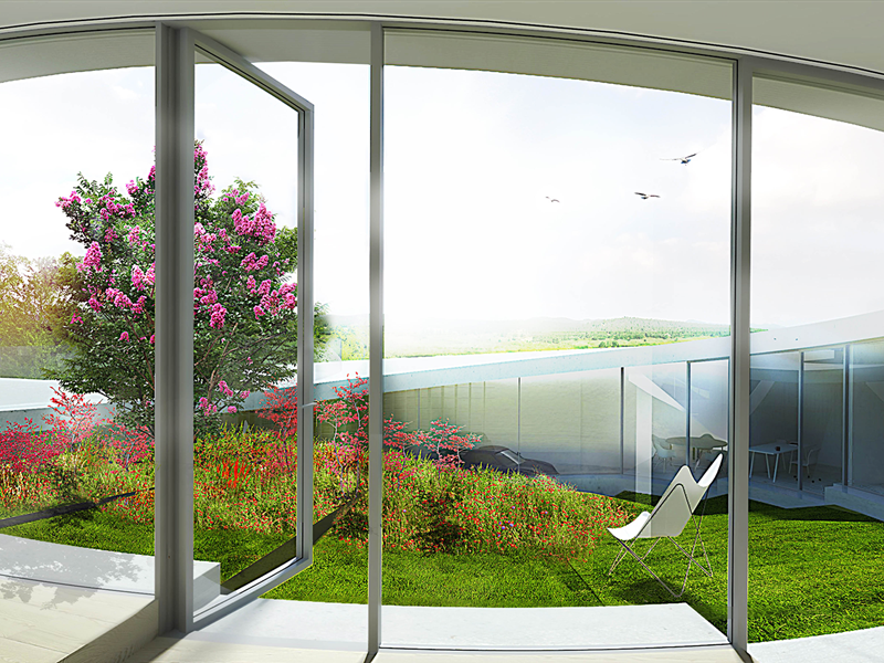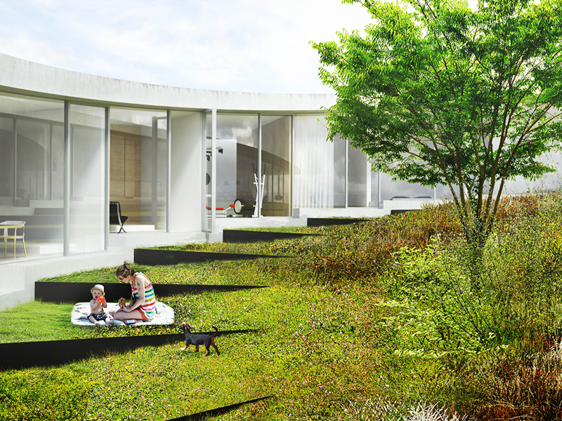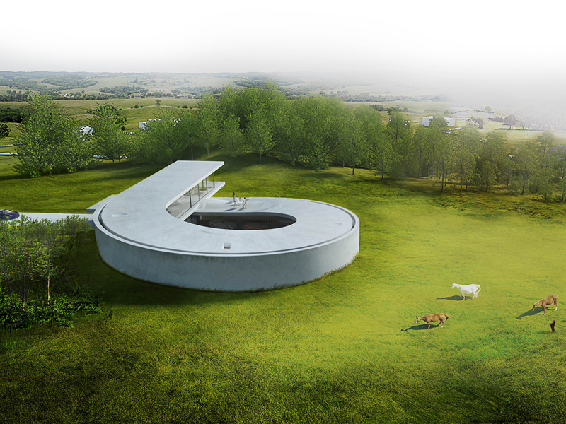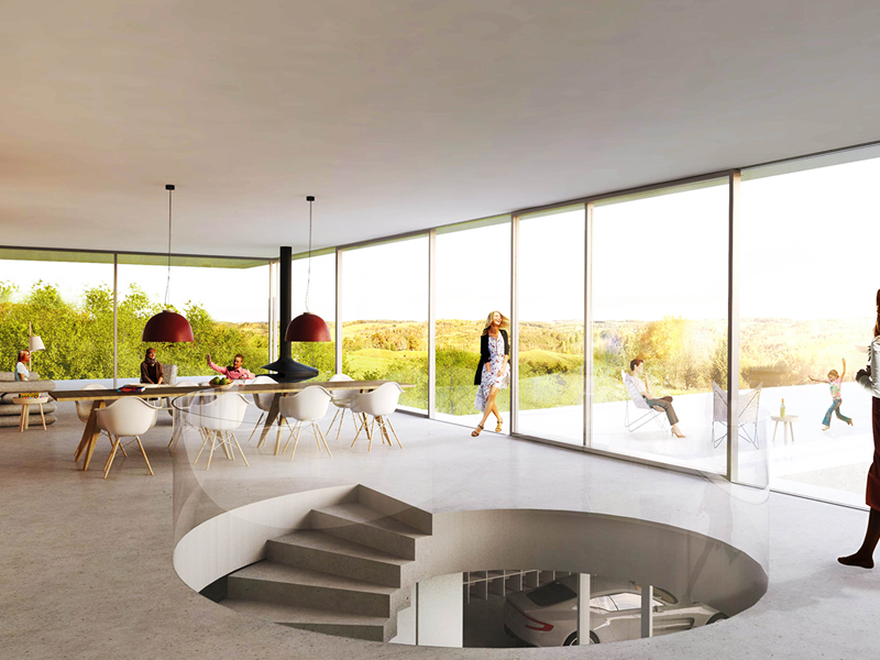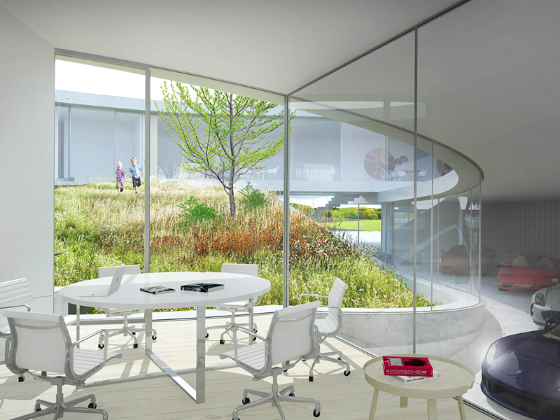 Derfor er ideen om en sneglehusformet arkitektur opstået, hvor forløbet i hjemmet skal føre familien fra den store garage direkte ind i den private afdeling. Og takket være store glasfacader på indersiden af bygningen er der fra alle værelserne i bygningen frit udsyn til bilerne.